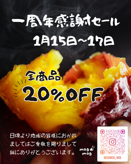 🎉おいも専門店mogmog 1周年記念セール開催🍠 公開日:2026年1月15日 mogmog 2026年1月15日(木)~1月17日(土)の3日間 全商品20%OFFセール 開催致します! いつもおいも専門店mogmogの焼き芋をご愛顧いただき、誠にありがとうございます。 おかげさまで、この度無事に開店1周年を迎 […] 続きを読む